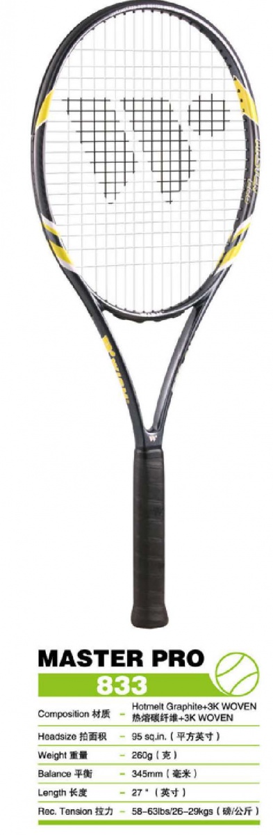 Ракетка WISH MASTER PRO 833 - проф.серии.Материал - Hotmelt graphite +3k WovenВес - 260г. Баланс - 345мм.Размер 95 кв. дюймов.Длина - 27".Натяжение струн - 58-63 lbs/26-29 kgs
