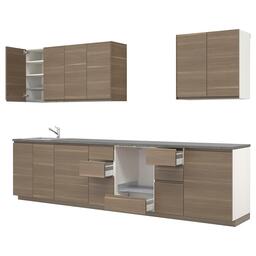 В комплект входит: мойка, смеситель, выпуск, шкафы, ящики, дверцы, столешница, ножки, цоколи, полки, петли и крепления.