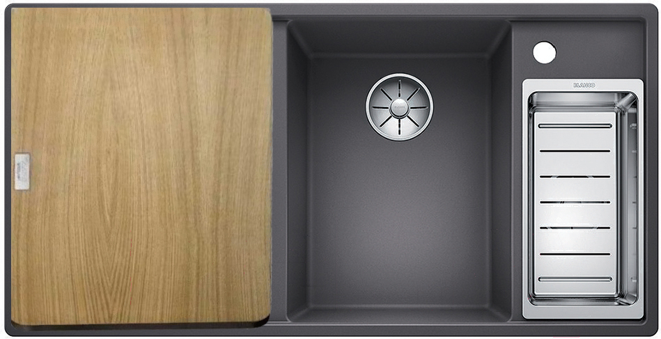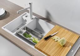 • Комплект поставки клапан-автомат, коландер, корзинчатый вентиль 3.5", мойка, отводная арматура InFino®, разделочный столик