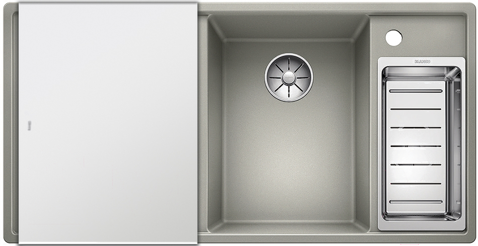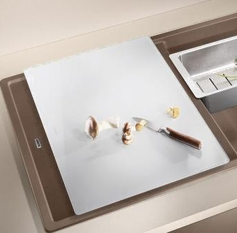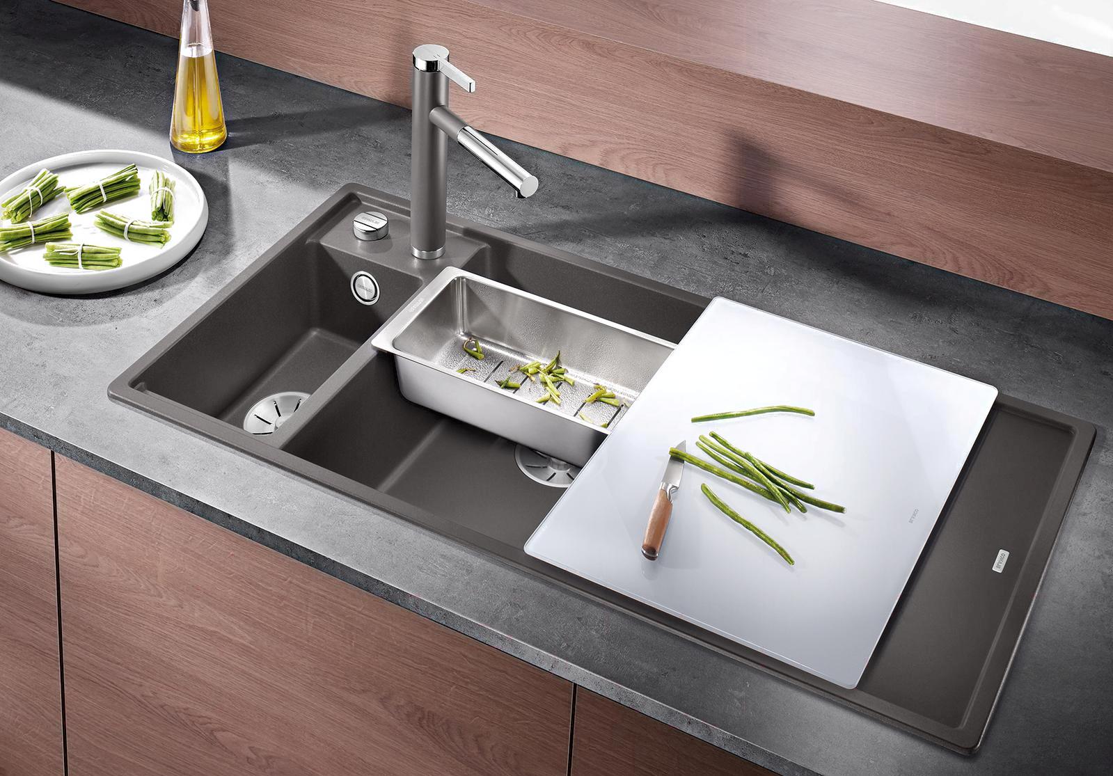 • Комплект поставки клапан-автомат, коландер, корзинчатый вентиль 3.5", разделочная доска (из безопасного стекла), мойка, отводная арматура InFino®