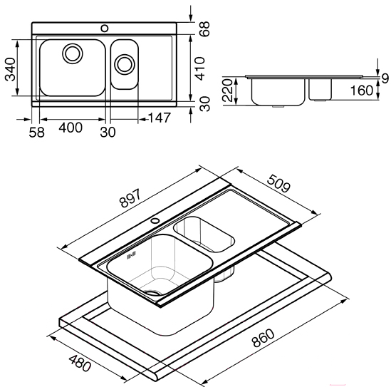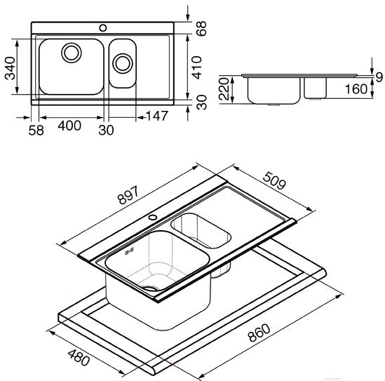 - Толщина мойки 9 мм