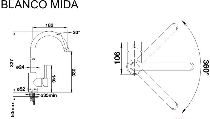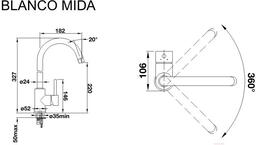 • Комплект поставки смеситель (Blanco Mida), отводная арматура, корзинчатый вентиль 3.5" (2 шт.), мойка