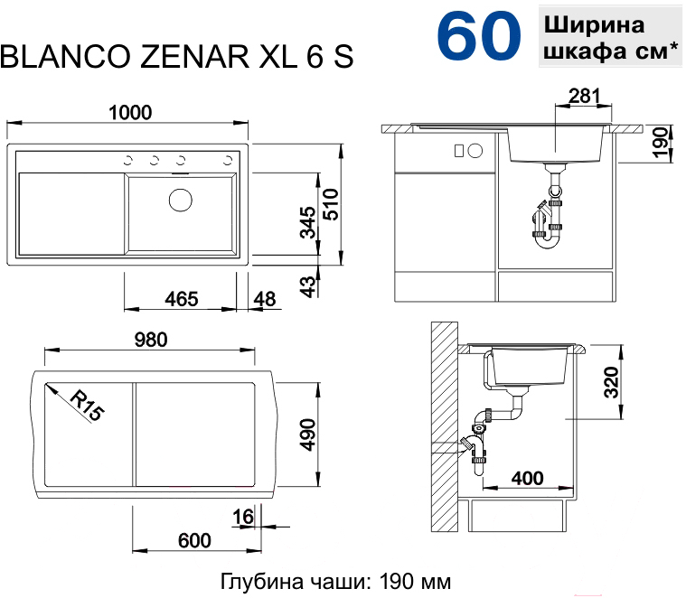 • Мин. ширина шкафа 60 см