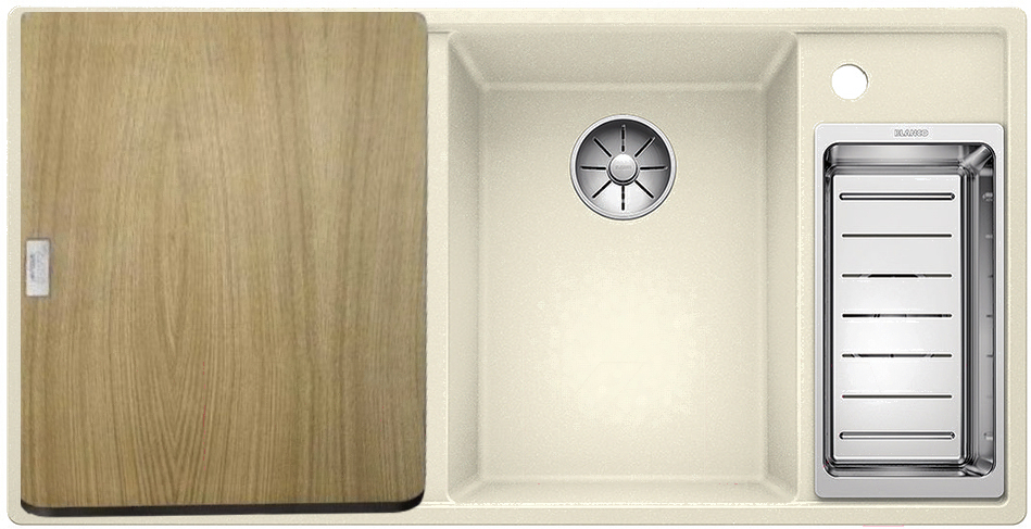 • Комплект поставки клапан-автомат, коландер, корзинчатый вентиль 3.5", мойка, отводная арматура InFino®, разделочный столик