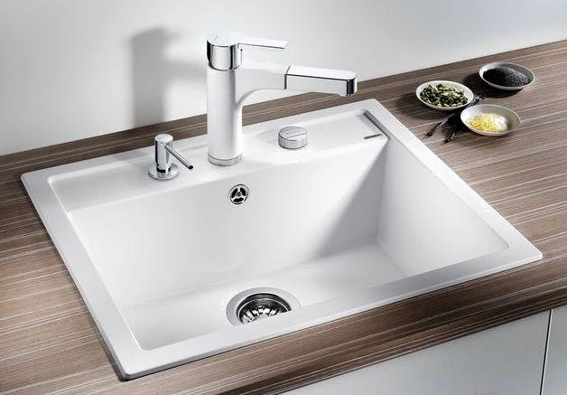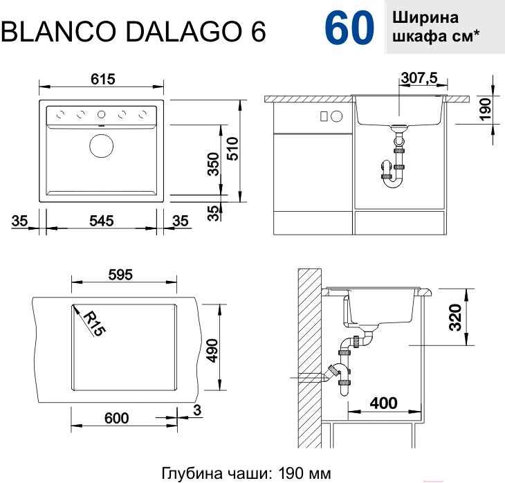 Мойка кухонная Blanco Dalago 6 / 518850; Способ установки: врезная на столешницу, врезная под столешницу; Диаметр сливного отверстия: 3.5"; Длина/диаметр мойки: 61.5 см; Ширина мойки: 51 см; Материал: искусственный гранит; Комплект поставки: клапан-автомат, отводная арматура, мойка; Глубина чаши: 19 см; Отверстие для смесителя: есть