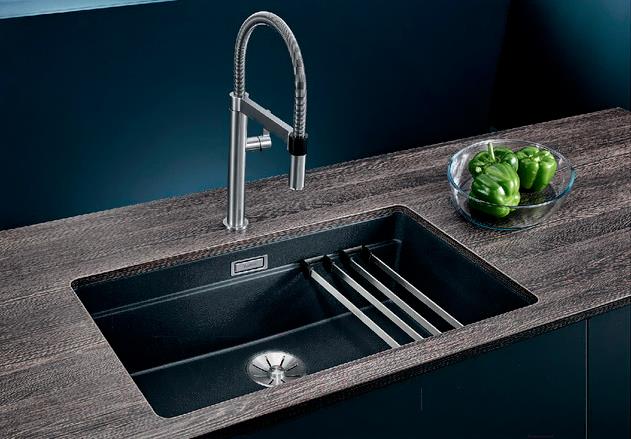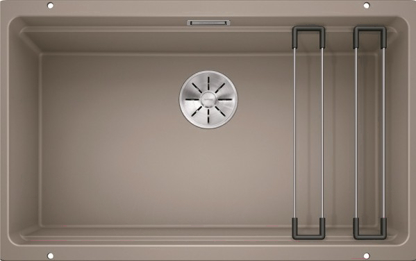 • Комплект поставки крепления (без уплотнителя), перелив, корзинчатый вентиль 3.5", держатели (Blanco Etagon, нерж.сталь), мойка, отводная арматура InFino®