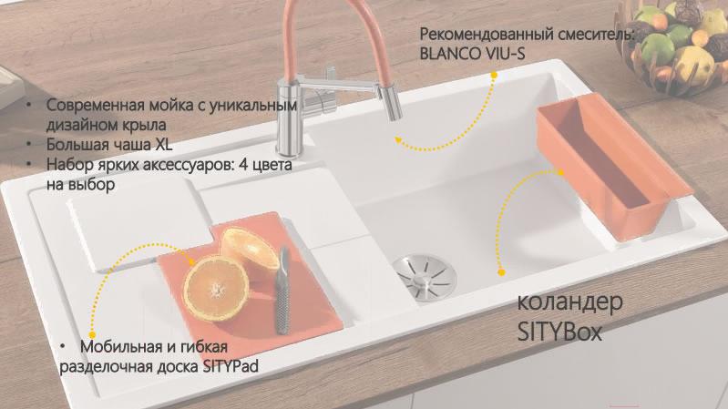 • Дополнительная комплектация коландер (SITYBox), корзинчатый вентиль 3.5", разделочная доска (SITYPad, гибкая), мойка, отводная арматура InFino