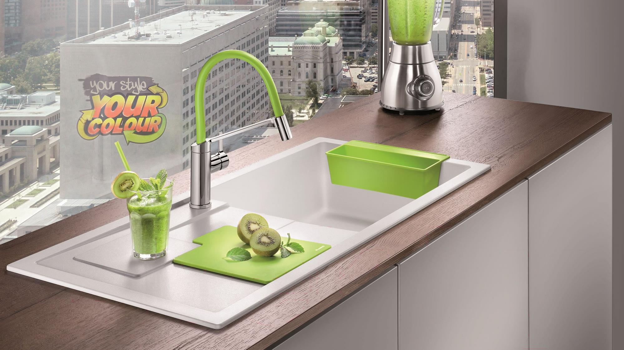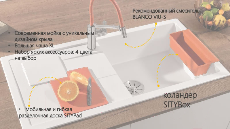 • Комплект поставки коландер (SITYBox), корзинчатый вентиль 3.5", разделочная доска (SITYPad, гибкая), мойка, отводная арматура InFino