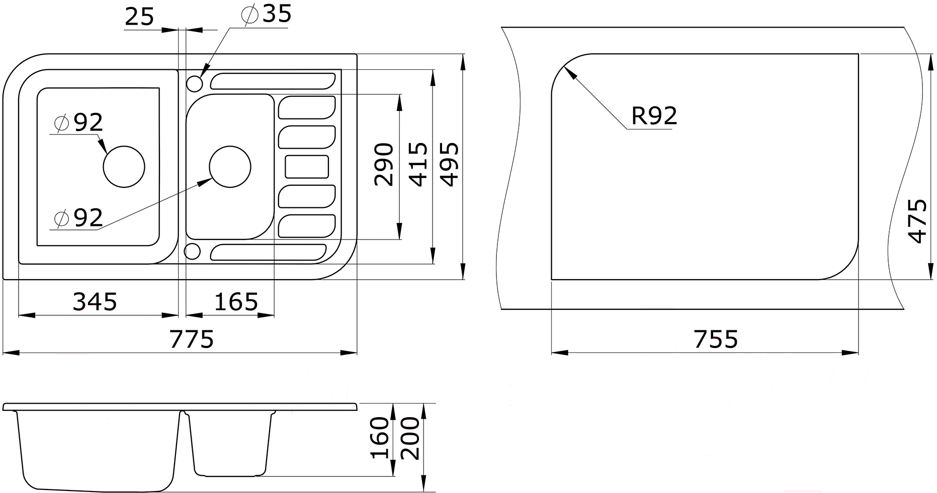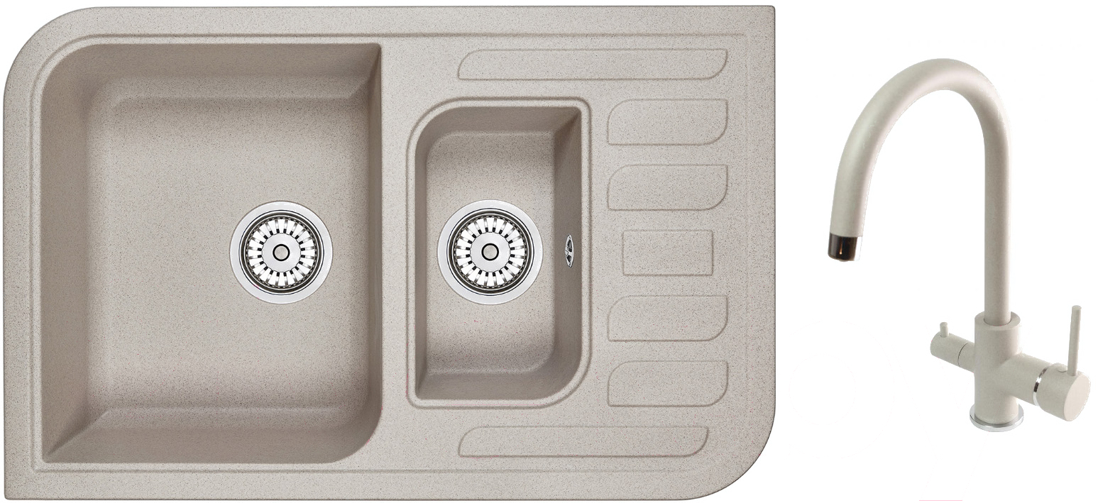 • Комплект поставки герметик, сифон, сливная арматура, смеситель (GR-3509L), инструкция, корзинчатый вентиль 3.5", мойка