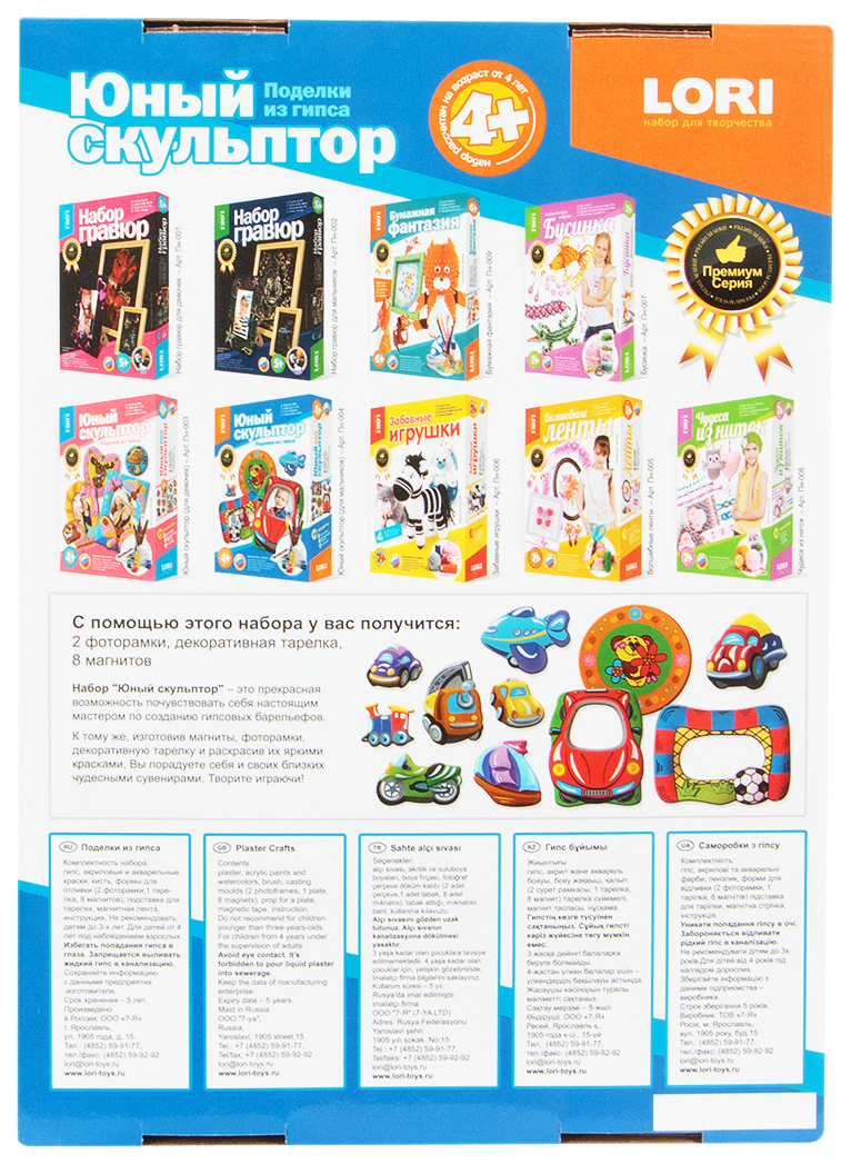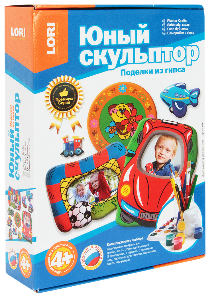 - Состав набора гипс; акриловые краски; акварельные краски; кисть; формы для отливки (2 фоторамки; 1 тарелка; 8 магнитов); подставка для тарелки; магнитная лента; инструкция