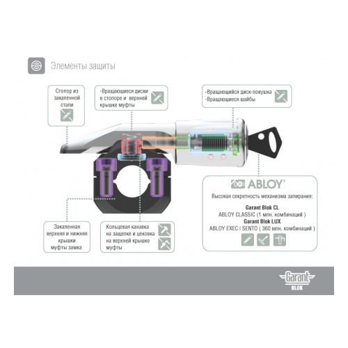 Замок блокирует рулевой вал транспортного средства посредством муфты, жёстко закреплённой на рулевом валу, и стопора, который вставляется в муфту и препятствует обороту рулевого вала, упираясь в элементы автомобиля. Стопор устанавливается в муфту автоматически, без манипуляции ключом. Снятие стопора с муфты происходит с помощью ключа Abloy
