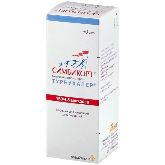 Всасывание. Симбикорт Турбухалер биоэквивалентен соответствующим монопрепаратам в отношении системного действия будесонида и формотерола. Несмотря на это, было отмечено небольшое усиление супрессии кортизола после приёма Симбикорта Турбухалера по сравнению с монопрепаратами. Это различие не оказывает влияния на клиническую безопасность. Отсутствуют доказательства фармакокинетического взаимодействия будесонида и формотерола. Фармакокинетические показатели для соответствующих веществ сравнимы после назначения будесонида и формотерола в виде монопрепаратов и в составе Симбикорта Турбухалера. Для будесонида, при введении в составе комбинированного препарата, площадь под кривой “концентрация-время” (AUC) несколько больше, всасывание препарата происходит быстрее и величина максимальной концентрации в плазме крови выше. Для формотерола при введении в составе комбинированного препарата максимальная концентрация в плазме крови совпадает с таковой для монопрепарата. Ингалируемый будесонид быстро абсорбируется и достигает максимальной концентрации в плазме через 30 минут после проведения ингаляции. Средняя доза будесонида, попавшего в лёгкие после проведения ингаляции через Турбухалер, составляет 32-44% от доставленной дозы. Системная биодоступность составляет примерно 49% от доставленной дозы. У детей в возрасте от 6 до 16 лет средняя доза будесонида, попавшего в лёгкие после проведения ингаляции через Турбухалер, не отличается от показателей у взрослых пациентов (конечная концентрация препарата в плазме крови не определялась). Ингалируемый формотерол быстро абсорбируется и достигает максимальной концентрации в плазме крови через 10 минут после проведения ингаляции. Средняя доза формотерола, попавшего в лёгкие после проведения ингаляции через Турбухалер, составляет 28-49% от доставленной дозы. Системная биодоступность составляет около 61% от доставленной дозы. Распределение и метаболизм. С белками плазмы связывается примерно 50% формотерола и 90% будесонида. Объем распределения для формотерола составляет около 4 л/кг и для будесонида - 3 л/кг. Формотерол инактивируется путем конъюгации (образуются активные О-деметилированные метаболиты в основном в виде инактивированных конъюгатов). Будесонид подвергается интенсивной биотрансформации (около 90%) при первом прохождении через печень с образованием метаболитов, обладающих низкой глюкокортикостероидной активностью. Глюкокортикостероидная активность основных метаболитов- 6-бетта-гидроксибудесонида и 16-альфа-гидроксипреднизолона -не превышает 1% аналогичной активности будесонида. Не существует доказательств взаимодействия метаболитов или реакции замещения между будесонидом и формотеролом. Основная часть дозы формотерола подвергается метаболизму в печени и затем выводится почками: после ингаляции 8-13% доставленной дозы формотерола выводится в неизмененном виде. Формотерол имеет высокий системный клиренс (примерно 1,4 л/мин); период полувыведения препарата составляет в среднем 17 часов. Будесонид метаболизируется преимущественно с участием фермента CYP3A4. Метаболиты будесонида выводятся почками в неизменённом виде или в форме конъюгатов. В моче обнаруживается только незначительное количество неизмененного будесонида. Будесонид имеет высокий системный кли