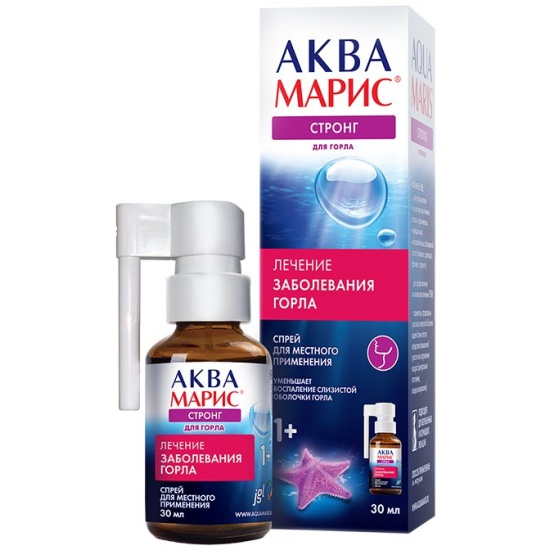 Состав 100 % стерильный гипертонический раствор воды Адриатического моря с натуральными солями и микроэлементами. Не содержит консервантов. Присутствие ионов: Натрий (Na+) - не менее 7,50 мг/мл; Кальций (Ca2+) - не менее 0,25 мг/мл; Калий (K+) - не менее 0,20 мг/мл; Магний (Mg2+) - не менее 1,00 мг/мл; Хлориды (Cl-) - не менее 16,50 мг/мл; Сульфаты (SO42-) – не менее 1,80 мг/мл; Гидрокарбонаты (HCO3-) – не менее 0,10 мг/мл; Бромиды (Br-) - не менее 0,04 мг/мл. Фармакологическое действие Препарат на основе гипертонического стерильного раствора морской воды применяется с лечебными, профилактическими и гигиеническими целями для очищения, снятия раздражения и защиты слизистой оболочки горла. Микроэлементы, входящие в состав препарата, усиливают резистентность слизистой оболочки горла к болезнетворным бактериям и вирусам, способствуют повышению местного иммунитета. Натуральный препарат на основе воды Адриатического моря для снятия симптомов раздражения при воспалительных заболеваниях горла у взрослых и детей с 1-го года. Что представляет собой Аква Марис® Стронг для Горла? Это гипертонический раствор морской воды. Выпускается в форме дозированного спрея. Не содержит химических добавок и консервантов. Рекомендован к применению детям с 1-го года беременным и кормящим женщинам. Особенно показан тем малышам, которые еще не умеют полоскать горло или делают это крайне неохотно. Аква Марис® Стронг для Горла не имеет резкого запаха или вкуса, поэтому дети охотно соглашаются им лечиться. Его эффективность сопоставима с использованием синтетических средств, применяемых при лечении горла. Спрей Аква Марис® Стронг для Горла используется для лечения острых и хронических воспалительных заболеваний слизистой оболочки горла. Препарат способствует удалению слизи и налета, содержащих болезнетворные бактерии. Обладает противовоспалительным и противомикробным действием. Входящие в состав препарата микроэлементы морской воды способствуют восстановлению слизистой и поддержанию местного иммунитета. Рекомендован при: Тонзиллите — воспалении миндалин Аденоидите — воспалении носоглоточной миндалины Фарингите — воспалении задней стенки глотки Ларингите — воспалении гортани Аква Марис® Стронг для Горла Устраняет воспаление слизистой оболочки горла Повышает местный иммунитет Повышает устойчивость к бактериям и вирусам