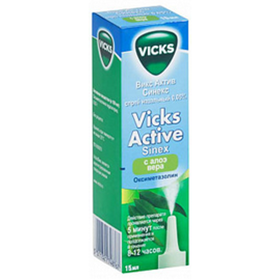 Показания к применению Для облегчения носового дыхания при «простудных» заболеваниях или вирусных инфекциях верхних дыхательных путей, синусите, рините любой этиологии. Перед использованием других препаратов Викс Актив внимательно читайте этикетку, чтобы применять эти препараты правильно. Противопоказания к применению повышенная чувствительность к компонентам препарата; атрофический (сухой) ринит; прием ингибиторов моноаминооксидазы (МАО) в течение предшествующих 2-х недель и в течение 2-х недель после их отмены; закрытоугольная глаукома; состояние после транссфеноидальной гипофизэктомии; детский возраст до 6 лет; беременность; период лактации. С осторожностью следует применять препарат у больных, страдающих заболеваниями сердечно-сосудистой системы (артериальная гипертензия, ишемическая болезнь сердца, хроническая сердечная недостаточность, тахикардия, аритмии), нарушением углеводного обмена (сахарный диабет), функции щитовидной железы (гипертиреоз), феохромоцитомой, хронической почечной недостаточностью, гиперплазией предстательной железы (задержка мочи) и, принимающих трициклические антидепрессанты и бромокриптин. Побочные действия Иногда жжение или сухость слизистых оболочек носа, сухость в полости рта и горле, чихание, увеличение объема секрета, выделяющегося из носа. В редких случаях – после того, как пройдет эффект от применения препарата, сильное чувство «заложенности» носа (реактивная гиперемия). Побочные эффекты, обусловленные системным действием препарата: повышение артериального давления, головная боль, головокружение, сильное сердцебиение, тахикардия, повышенная тревожность, седативный эффект, раздражительность, нарушения сна (у детей), тошнота, бессонница, экзантема, нарушение зрения (при попадании в глаза). Консервант бензалкония хлорид, входящий в состав препарата, может быть причиной отечности слизистой оболочки носа. Если это произошло, необходимо поменять препарат на другой, не содержащий консервантов. Дозировка Интраназально. Взрослым и детям старше 10 лет – по 1-2 впрыскивания в каждый носовой ход максимально 2 – 3 раза в день. Детям от 6 до 10 лет – по 1 впрыскиванию в каждый носовой ход максимально 2-3 раза в день. Не рекомендуется применять препарат более 7 дней. При частом или длительном использовании препарата чувство затруднения носового дыхания может появиться вновь или ухудшиться. При появлении этих симптомов следует прекратить лечение и обратиться к врачу. При впрыскивании не запрокидывать голову назад и не распылять в положении лежа. Передозировка Симптомы: тошнота, повышение артериального давления, тахикардия, угнетение ЦНС.