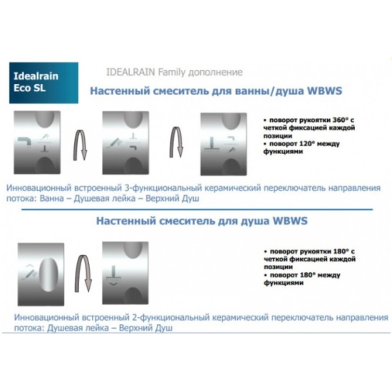 Поворот рукоятки на 360°Четкая фиксация переключателяЯсная и понятная индикация режимовНастройка угла наклона верхнего душаВозможность замены любых элементов системы (смеситель, лейка, верхний душ)Трех-функциональная душевая лейкаПропускная способность: заполнение на 30% быстрее, излив – 22 л, верхний душ – 11 л, ручная лейка – 8 л.Ограничители потока воды - экономия водыНизкая шумность. Соответствие классу I Европейских норм NN817Регулируемое креплениеДолговечное покрытие никель/хромСамоочищающиеся форсункиКаскадный аэратор, который никогда не забиваетсяКнопочная регулировка высот держателя лейки (легкость управления)
