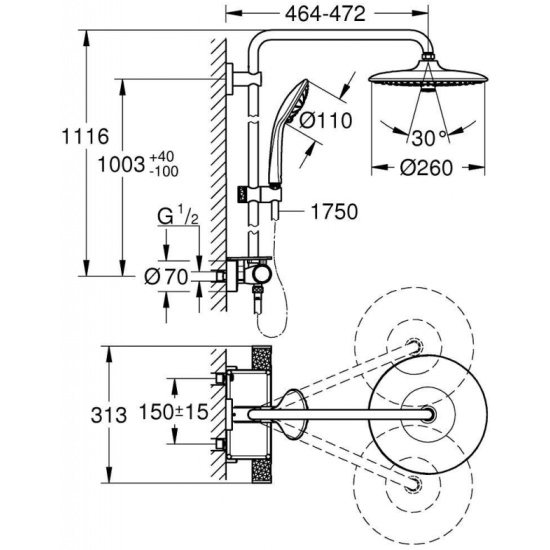 Душевая система с термостатом для душа GROHE Vitalio Joy 260, хром включает в себя:горизонтальный поворотный душевой кронштейн 450 мм Precision Joy Термостат с функцией Aquadimmerвыбор между:верхний душ Vitalio Joy 260 (26 462)Rain, SmartRain, Jetс шаровым шарниромугол поворота ± 15°ручной душ Vitalio Joy 110 Massage (27 319 000), 3 вида струй:Rain / Massage / SmartRainрегулируется по высоте с помощью скользящего элементадушевой шланг VitalioFlex Silver 1.750 mm, ½" x ½" (27 506 000)GROHE EasyReach Полочка (26 362 LN0)GROHE TurboStat встроенный термоэлементGROHE SafeStop стопор безопасности при 38°CGROHE SafeStop Plus опционно ограничитель температуры на 43°C, включенGROHE CoolTouch Полностью исключается вероятность ожога о внешнюю поверхность смесителяProGrip эргономичные рукоятки с рифленой поверхностьюGROHE DreamSpray превосходный поток водыGROHE StarLight хромированная поверхностьGROHE EcoJoy ограничитель расхода воды 9,5 л/минGROHE SprayDimmerвнутренний охлаждающий канал для продолжительного срока службысистема SpeedClean против известковых отложенийTwistfree против перекручивания шлангасовместим с проточным водонагревателем только выше 18 кВ/ч, а также с накопительным водонагревателем (см. Техническую информацию)минимальный расход воды 7л/минминимальное давление 1,0 барGROHE EasyReach Полочка (26 362 LN0)