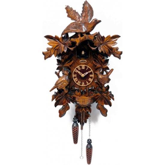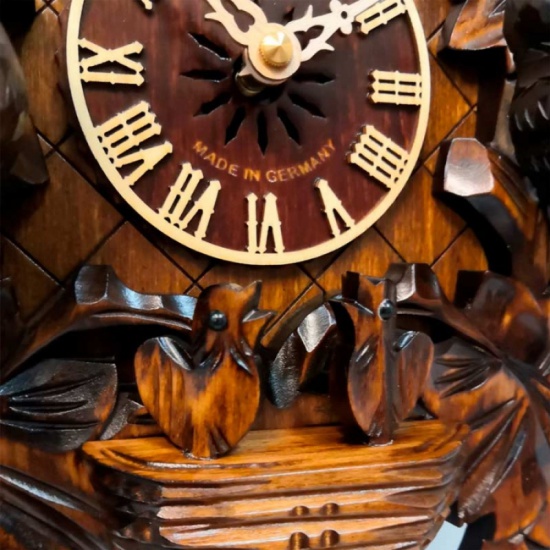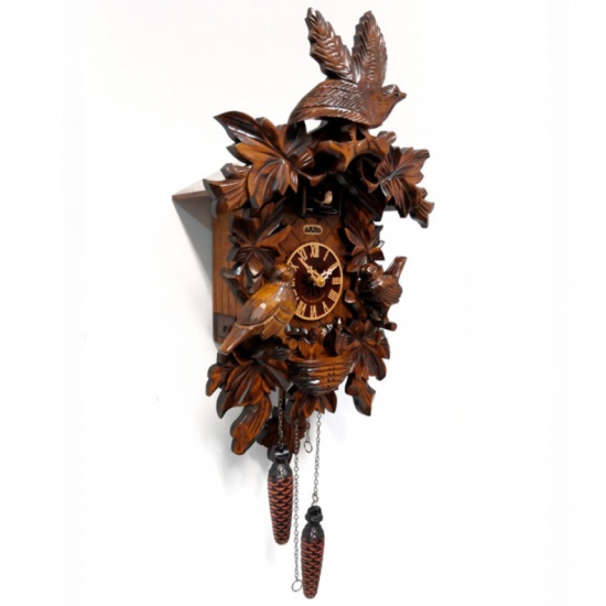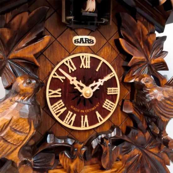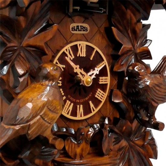 Часы с кукушкой SARS 0640-8Часы с кукушкой SARS 0640-8 (Германия) имеют надежный немецкий механизм и безупречное качество сборки и производства. Фасад часов украшают птицы наверху и по бокам. Внизу композиции находится гнездо с птенцами.- Корпус выполнен из натурального дерева, собран очень качественно опытными мастерами своего дела, декорирован резными элементами тонкой ручной работы и украшен ручной росписью. Филигранная резьба по дереву лучших мастеров Германии.- Кукушка срабатывает каждый полный час, кукует по количеству часов.- Автоматическое (с 22 до 7 утра) и ручное отключение кукования.- Отличительной особенностью этих часов является фотоэлемент, который обеспечивает автоматический переход в тихий режим в ночное время, т.е. кукушка не срабатывает. Также можно в любой момент отключить кукование вручную.Компания SARS воплощает воспоминание многих людей о счастливом детстве, бабушкиных сказках и уютных посиделках в кругу семьи. Часы являются хорошим подарком родным и близким, начальнику и партнерам.Характеристики часов SARS 0640-8:Дополнительные функции - кукушка срабатывает каждый час.Механизм - кварцевый (Германия)Производство- ГерманияРазмер- 45,5х30х17 смВысота без учета шишек 45 смКорпус - деревоМелодия - нетАвтоматическое (с 22 до 7 утра) и ручное отключение мелодии и кукованияИстория компании SARSКомпания была основана 13 мая 1943 в городе San Juan de Vilasar, Испания.Ранее планировалось совместное участие Швейцарского капитала, но из-за событий Второй Мировой Войны производство началось в 1945 году при полном финансировании Испанской стороной при участии Banco Hispano Colonial de Barcelona.В 1946 году была продана первая партия часов. В 1953 году в соответствии с новыми законами, предприятие было перерегистрировано как “Sociedad An