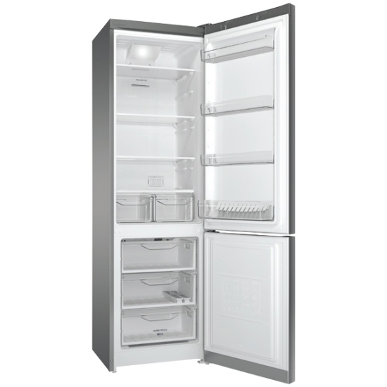 Корпус INDESIT DF 5200 характеризуется строгими четкими линиями, серебристый оттенок позволяет бытовой технике удачно вписаться в интерьер кухни у Вас дома и в офисе. Дисплей на передней панели предоставляет визуальный контроль и изменение температуры внутри обеих камер. Тоновый сигнал напоминает об открытой дверце холодильника. С целью быстро охладить или быстро заморозить продукты реализованы функции SuperCool и SuperFrost. Годовое потребление электричества лежит в пределах 378 кВт·ч, что обусловлено принадлежностью холодильника к классу энергоэффективности А.