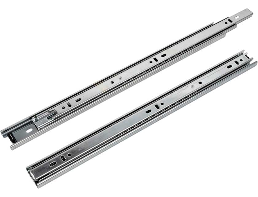 Шариковая направляющая является незаменимым комплектующим элементом при сборке мебели. Используется в качестве держателя для выдвижных полок, ящиков и шуфляд. Механизм надежно крепится, благодаря чему обеспечивает плавное и бесшумное перемещение. Надежная и долговечная конструкция выполнена из высококачественного и прочного металла в оттенке хром, за счет чего данная модель устойчива к механическим повреждениям и не подвержена деформации и износу. Оснащена 12 парами шариков. Размер изделия составляет 45х350 мм.
