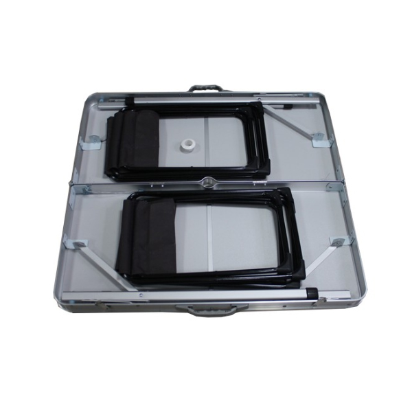 - Особенности В центре столешницы имеется отверстие для зонта. При сборке комплекта табуреты складываются внутрь стола. В сложенном состоянии набор представляет собой компактный чемоданчик с ручкой