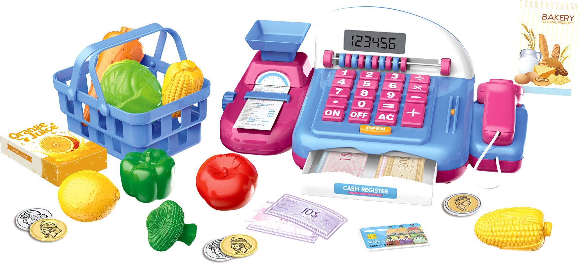 • Аксессуар в наборе касса, сканер продуктов, весы, корзина, деньги