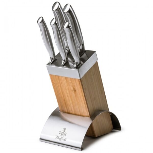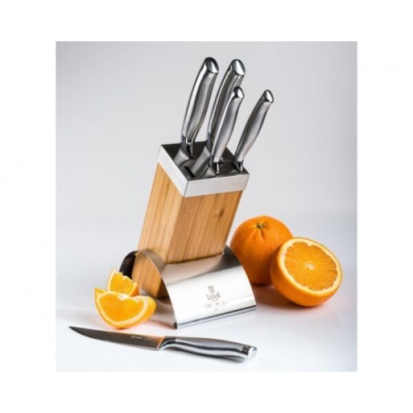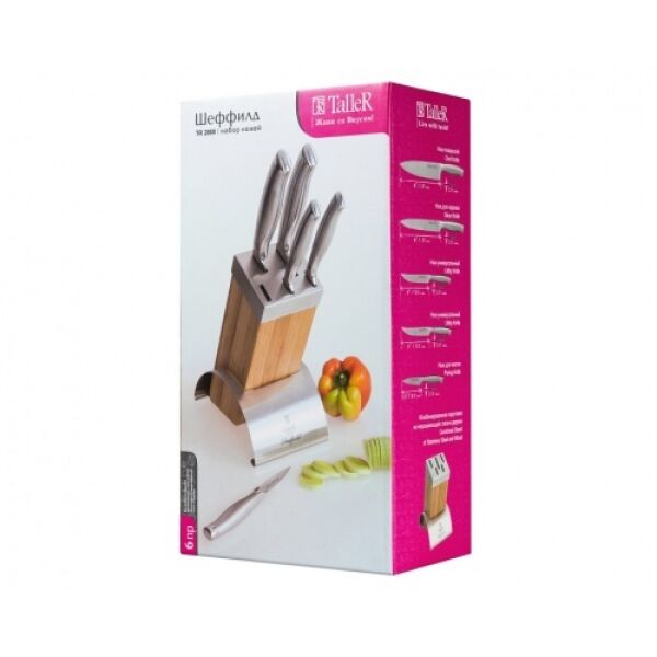 - Комплектация Нож универсальный, Нож для чистки овощей, Подставка, Нож для нарезки, Нож поварской