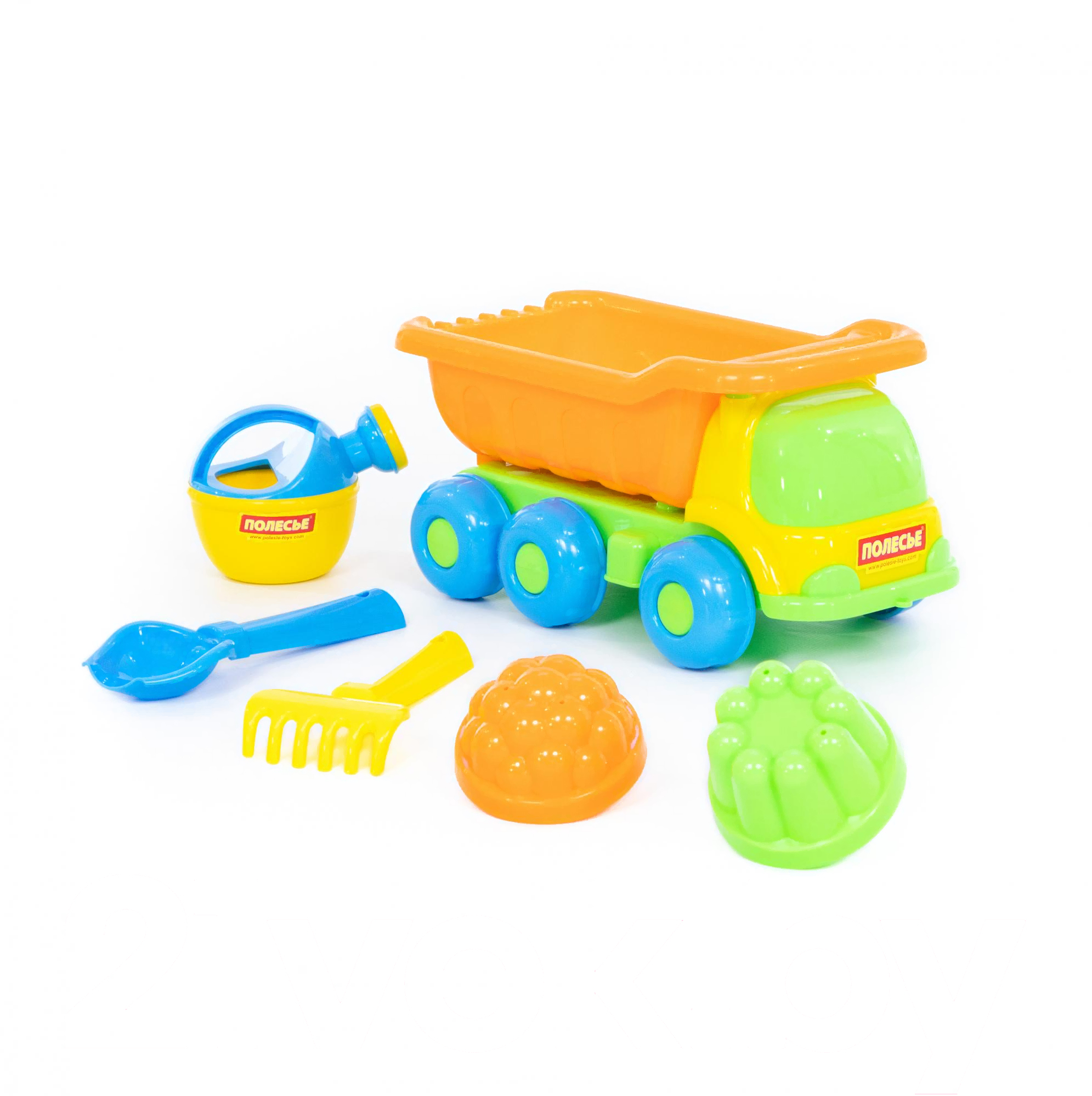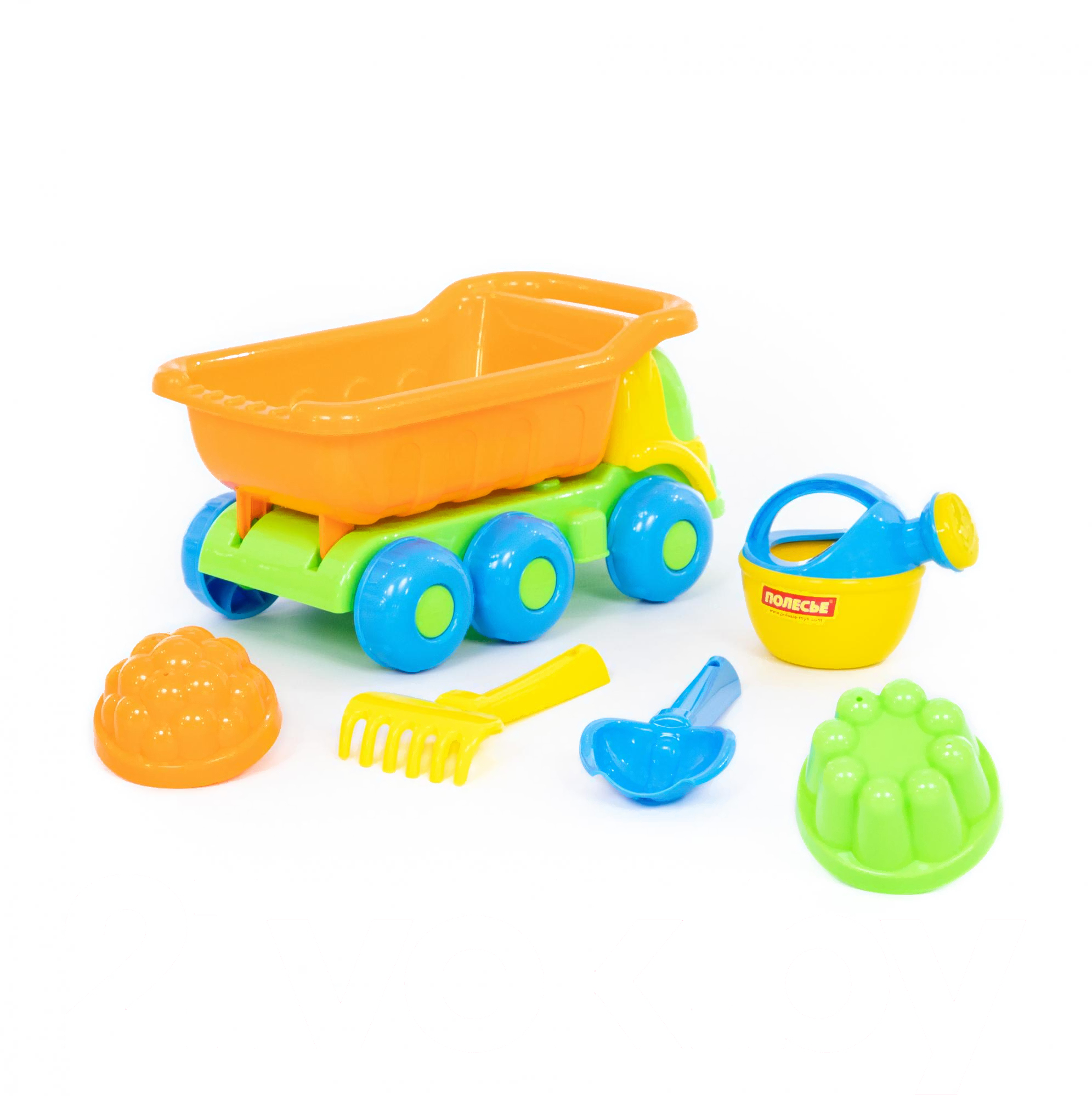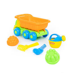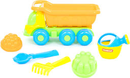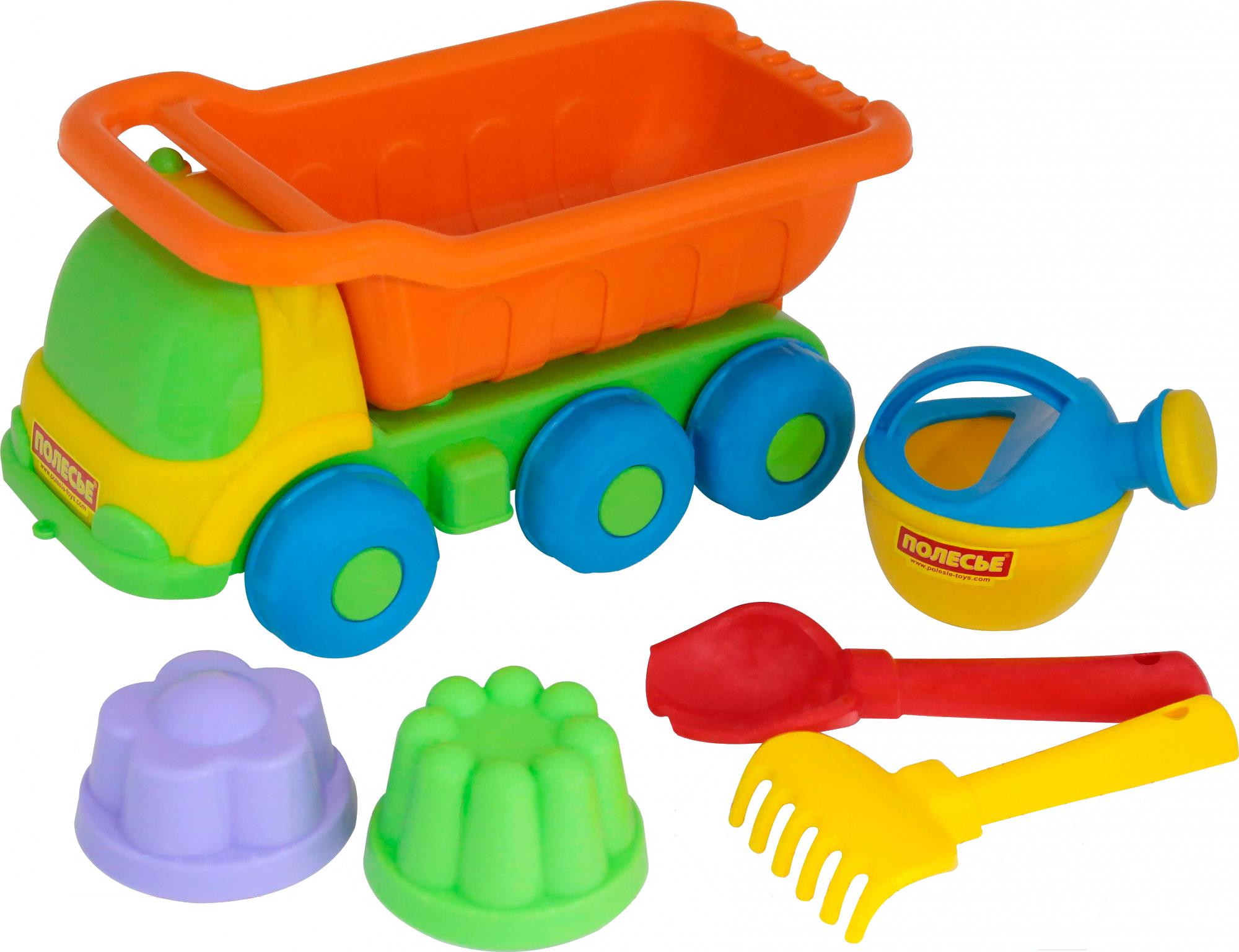 • В наборе лейка, лопатка, формочка (2 шт.), грабельки, машинка (грузовик)