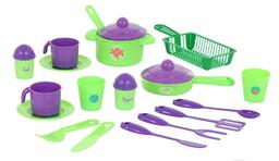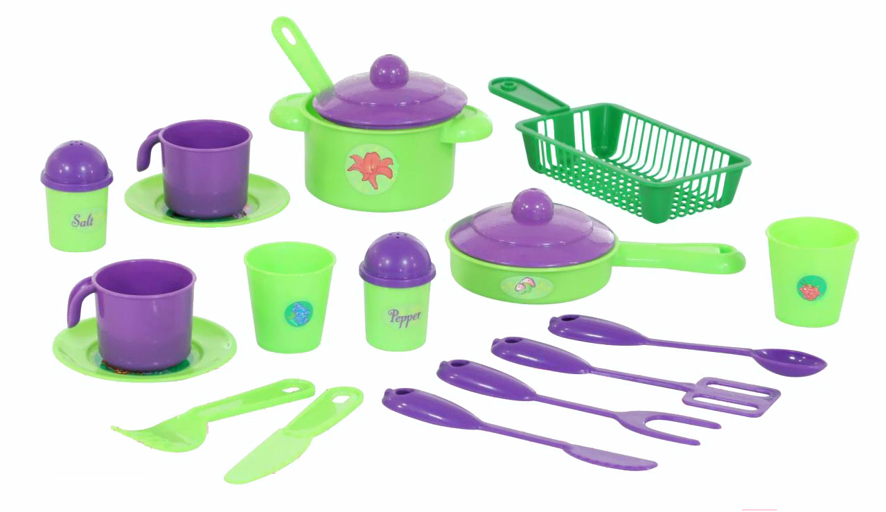 • Посуда в комплекте чашка (2 шт.), блюдце (2 шт.), ложка (1 шт.), вилка (1 шт.), нож (1 шт.), кастрюля (1 шт.), сковорода (1 шт.), стакан (2 шт.)