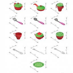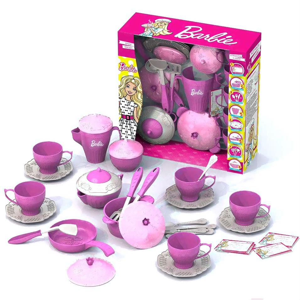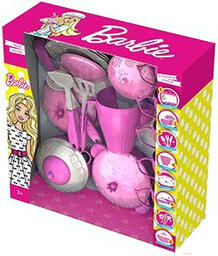 - Посуда в комплекте чашка (5 шт.), блюдце (5 шт.), кастрюля, сковорода, кухонные приборы (шумовка, лопатка - 2 шт, ложка - 3 шт, вилка, нож), чайник (2 шт.), сахарница