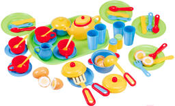 - Посуда в комплекте чашка (4 шт.), блюдце (4 шт.), емкость для хранения, кастрюля, сковорода, кухонные приборы (черпак, лопатка с прорезями, вилки, ножи, ложки, ), тарелка (4 шт.), стакан (4 шт.), чайник, кувшин, сахарница