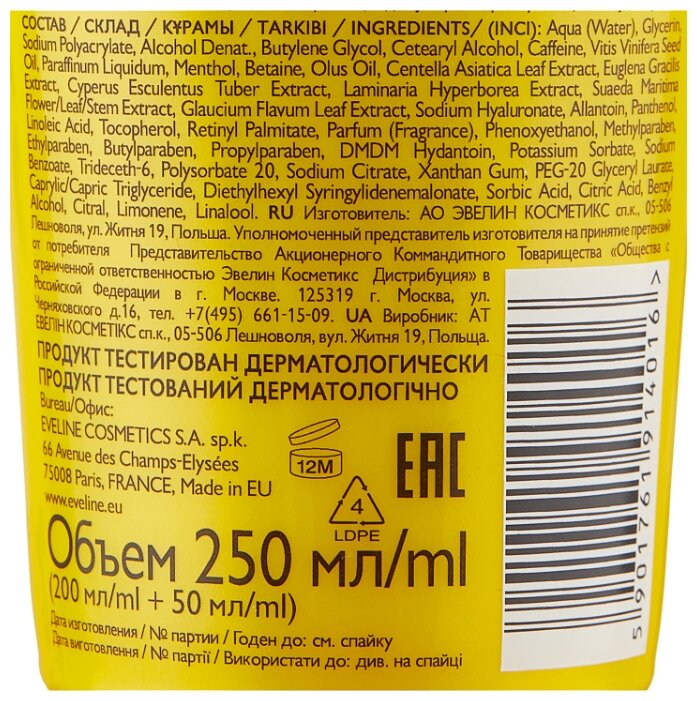 - Состав aqua (water), gycer sodum polyacrylate, alcohol denat., butylene glycol, cetearyl alcohol, caffeine, vitis vinifera sed o paraffinum liquidum, menthol, betaine, olus oil, centella asiatica leaf extract, euglena graol etract cyperus esculentus tuber extract, laminaria hyperborea extract, suaeda marana fower/leaf/stem extract, glaucium flavum leaf extract, sodium hyaluronate, allantoin, parcheno lroleic acid, tocopherol, retinyl palmitate, parfum (fragrance), phenoxyethanol, methyprber chyparaben, butylparaben, propylparaben, dmdm hydantoin, potassium sorbate sodum ezate, trideceth-6, polysorbate 20, sodium citrate, xanthan gum, peg-20 gycery laura caprylid/capric triglyceride, diethylhexyl syringylidenemalonate, sorbic acid, citnic acid, benzyl alcohol, citral, limonene, lonalool