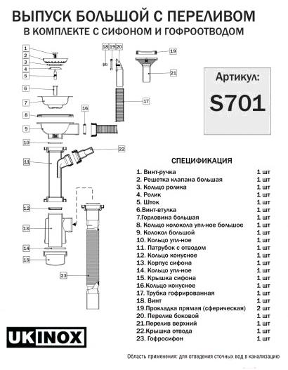 - Комплект поставки перелив, сифон, выпуск, гофра, прокладки