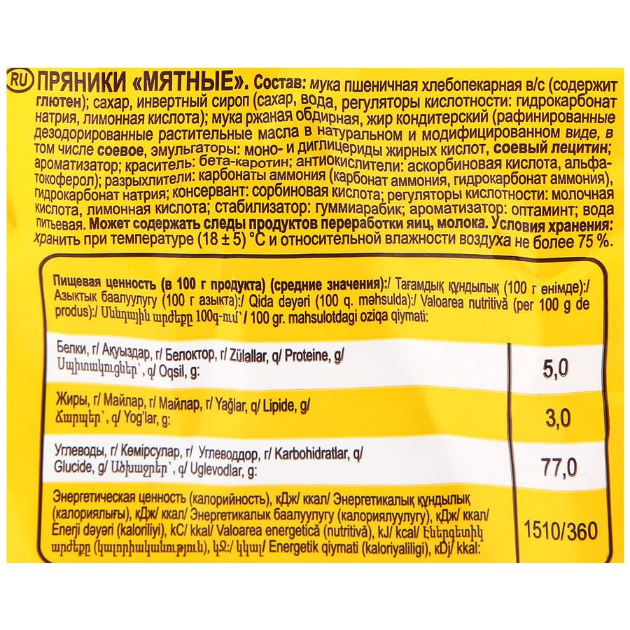 - Состав мука пшеничная общего назначения, сахар, инвертный сироп (сахар, вода, регуляторы кислотности: гидрокарбонат натрия, лимонная кислота), мука ржаная обдирная, жир кондитерский (рафинированные дезодорированные растительные масла в натуральном и модифицированном виде (пальмовое, подсолнечное, соевое), эмульгатор: соевый лецитин, антиокислитель: концентрат смеси токоферолов), жженка (сахар, вода), разрыхлители: карбонаты аммония, гидрокарбонат натрия, консервант: сорбиновая кислота, регуляторы кислотности: молочная кислота, лимонная кислота, стабилизатор: гуммиарабик, ароматизатор: оптаминт, вода