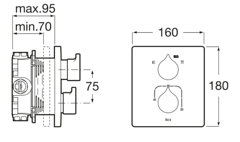 Смеситель для ванны/душа, термостат, встраиваемый, излив: фиксированный, кол-во монтажных отверстий 1, материал корпуса: латунь.