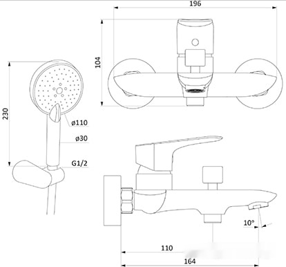 Смеситель для ванны/душа, однорычажный, излив: фиксированный, монтаж настенный, материал корпуса: латунь.