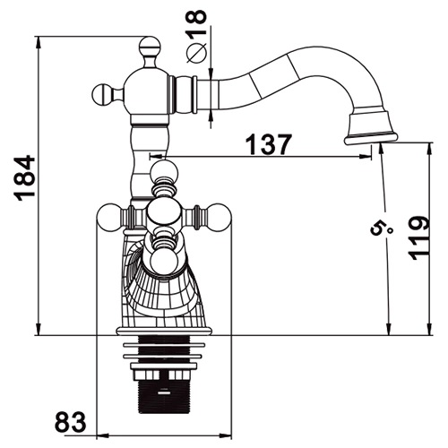 Смеситель для умывальника, двухвентильный, запорный механизм: кран-букса, излив: фиксированный, монтаж на поверхность сантехники, кол-во монтажных отверстий 1, материал корпуса: латунь.