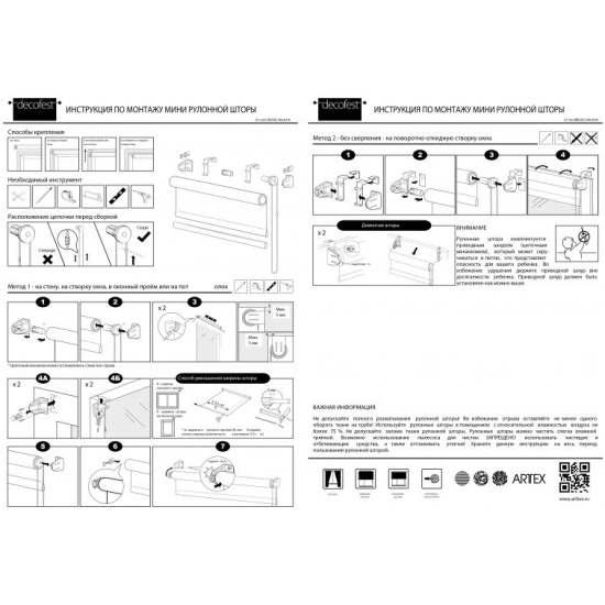 • Легкий монтаж – без сверления (для штор шириной до 120 см) на откидную створку окна или на стену/потолок с помощью шурупов.