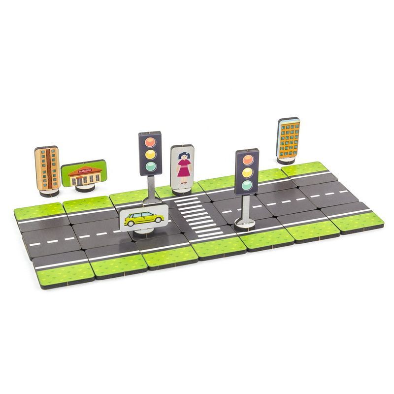Игрушка представляет собой набор деталей для конструирования дорог и комплект фигурок с изображениями людей, транспортных средств, домов и других объектов инфраструктуры.