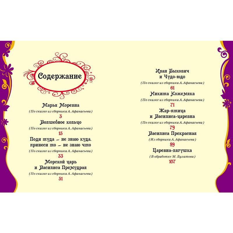 В книгу вошли самые известные русские волшебные сказки: «Марья Моревна», «Волшебное кольцо», «Поди туда — не знаю куда, принеси то — не знаю что», «Морской царь и Василиса Премудрая», «Иван Быкович и Чудо-юдо», «Никита Кожемяка», «Жар-птица и Василиса-царевна», «Царевна-лягушка». Яркие иллюстрации на каждой странице. Крупный шрифт. Тексты сказок адаптированы для детей от 3 до 5 лет. Художник — В. Нечитайло.