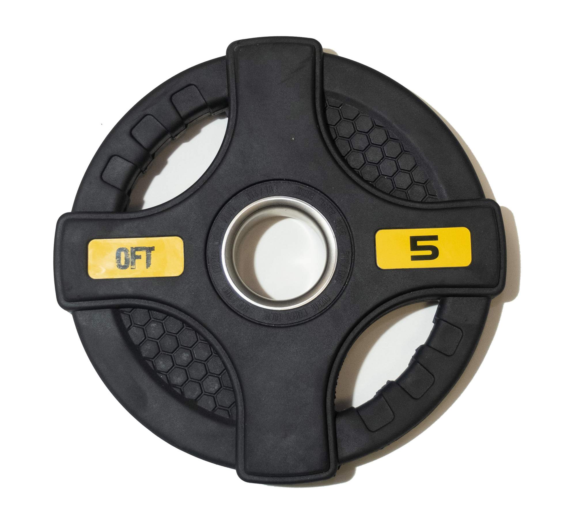 - Модель Диск олимпийский обрезиненный черный с двумя хватами 5 кг Original FitTools FT-2HGP-5