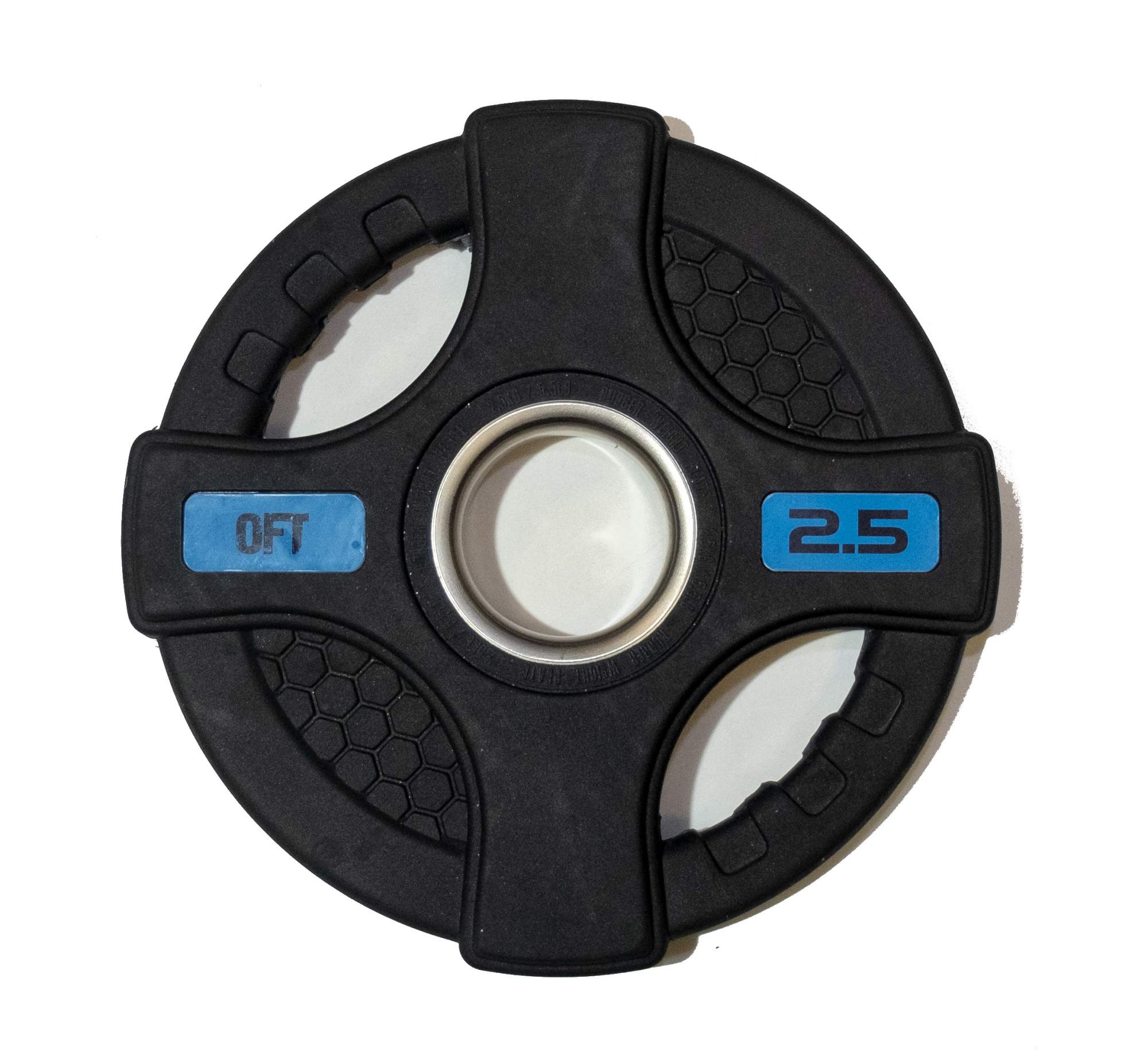 - Модель Диск олимпийский обрезиненный черный с двумя хватами 2,5 кг Original FitTools FT-2HGP-2,5