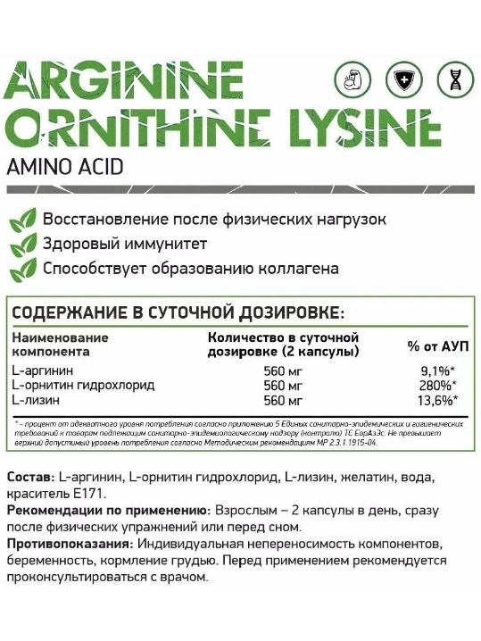 - Состав L-аргинин, L-орнитин гидрохлорид, L-лизин, оболочка капсулы (желатин, вода, краситель Е171)