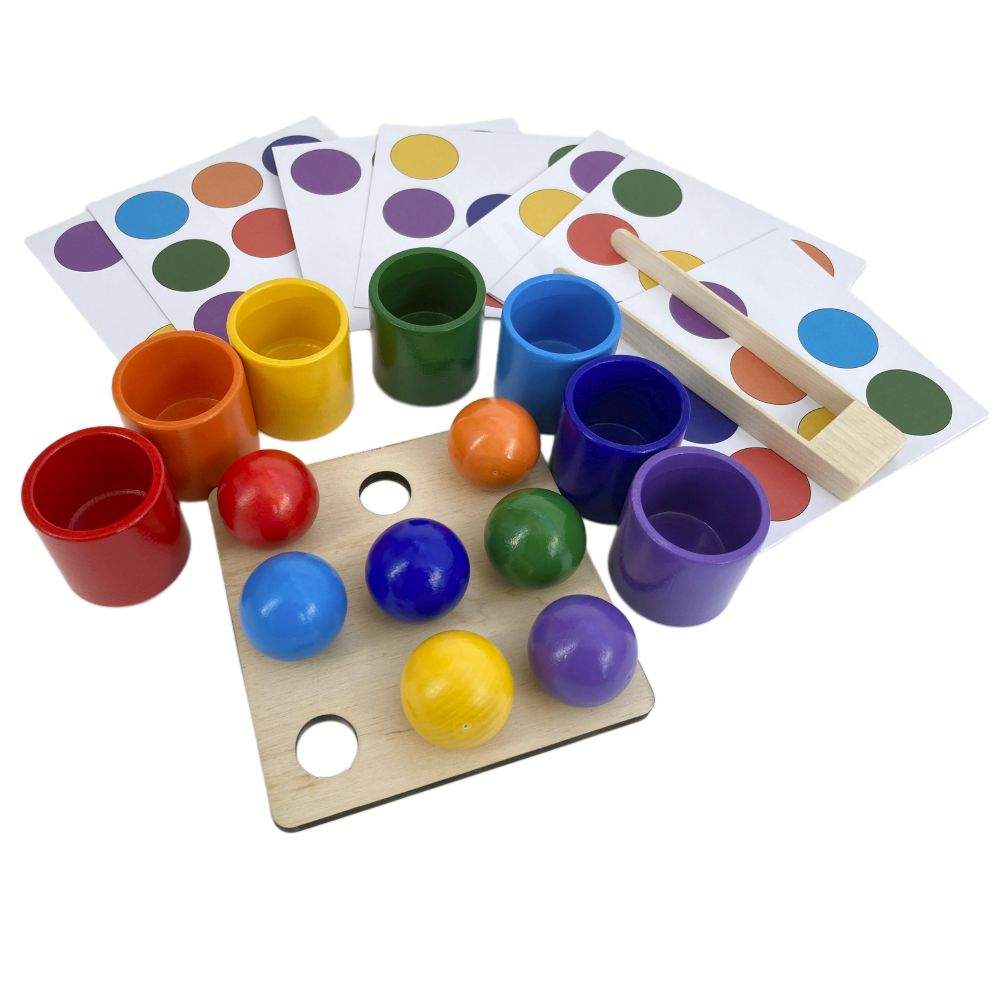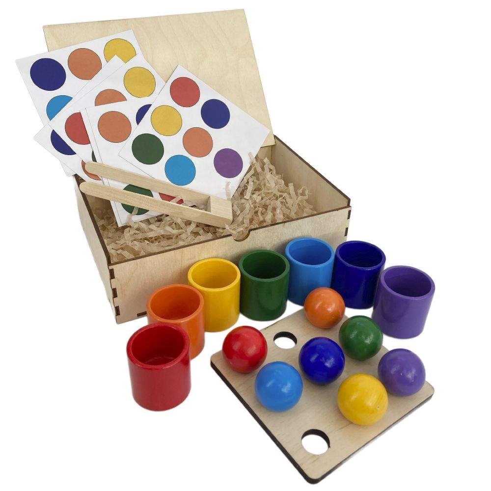 - Примечание Комплектация:-Шарики 7 цветов (красный, красный, оранжевый, желтый, зеленый, голубой, синий, фиолетовый) диаметром 30 мм.-Стаканчики 7 цветов (красный, красный, оранжевый, желтый, зеленый, голубой, синий, фиолетовый) 40*40 мм.-Деревянная дощечка с отверстиями под шарики для выполнения заданий 11*11 см.-Деревянный пинцет.-Карточки с заданиями - 7 штук (11*11 см.)-Инструкция с описанием игры.-Деревянная коробка для хранения игры.МАТЕРИАЛЫ: Дерево (липа), безопасный акриловый лак на водной основе, итальянская акриловая краска на водной основе.