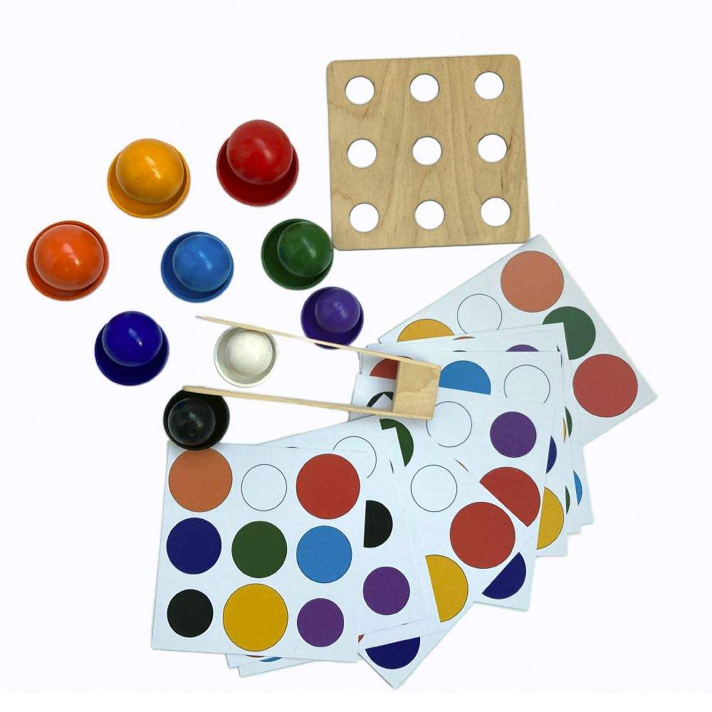 - Примечание Комплектация:-Шарики диаметром 35 мм., 30 мм. и 25 мм.-Тарелочки диаметром 40 мм., 35 мм. и 30 мм.-Деревянная дощечка с отверстиями под шарики для выполнения заданий 11*11 см.-Деревянный пинцет.-Карточки с заданиями - 9 штук (11*11 см.)-Инструкция с описанием игры.-Деревянная коробка для хранения игры.МАТЕРИАЛЫ: Дерево (липа), безопасный акриловый лак на водной основе, итальянская акриловая краска на водной основе.