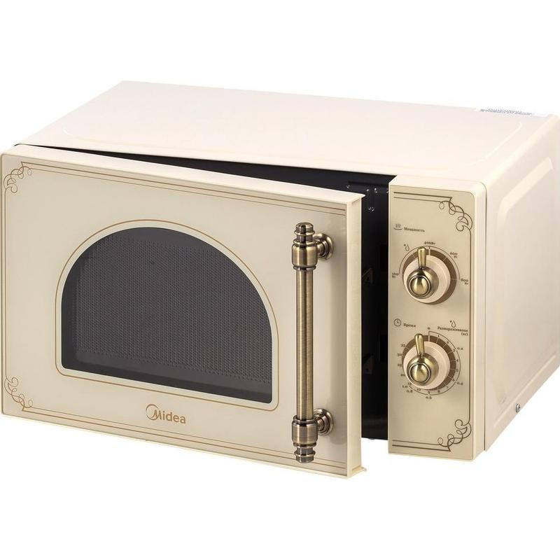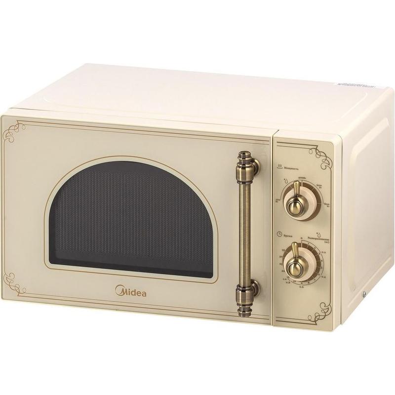 Midea MМ820CJ8-I2 — стильная микроволновая печь, дизайн которой выполнен в стиле ретро. Микроволновая печь оснащена простой механической системой управления, на освоение которой не понадобится много времени. Разработчики предусмотрели таймер. Внутреннее освещение камеры позволяет даже при закрытой дверце визуально определить степень готовности блюда.