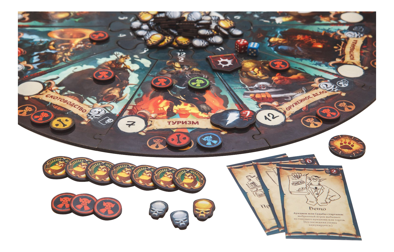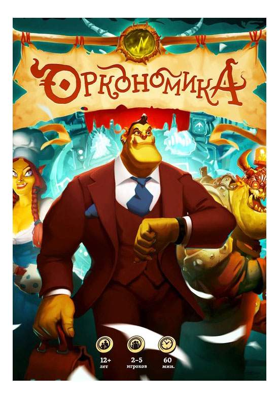 • Комплектация 50 фишек компаний, 31 трофей, 2 кубика Провидения, Жетон Активности, Жетон Кризиса, Жетон Оракула, 50 серебряных черепов, 30 золотых черепов, Жетон Ущербного Орка, 2 маркера со стирателями, 48 карт влияния, 5 карт памяток, Игровое поле из 10 секторов отраслей и центральной части, Правила игры
