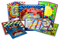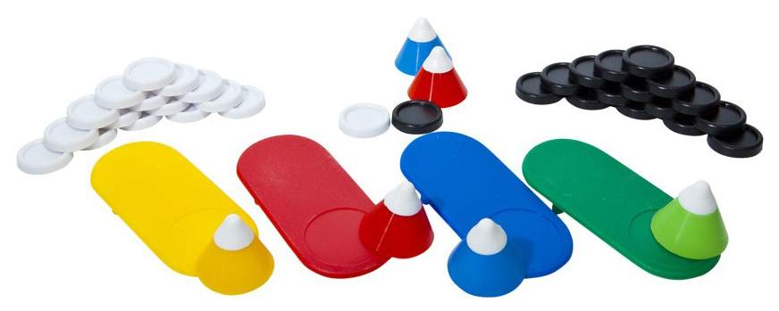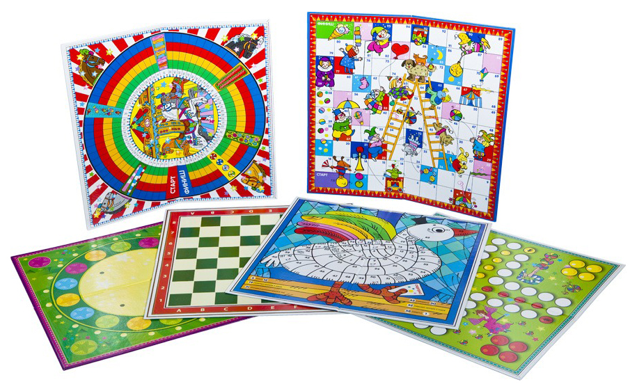 • Комплектация игровые поля (двусторонние) - 6 шт; шашки - 32 шт; наклейки на шашки (шахматы) - 32 шт (8 наклеек в рамках - запасные); кубики с точками - 3 шт; кубики цветные - 2 шт; фишки (красные, желтые, зеленые, синие) 16 шт; фишки (оранжевые и фиолетовые) - 10 шт; жетоны - 13 шт.; колпачки четырех цветов - 12 шт; батут сборный из картона - 1шт; катапульты - 4 шт; парные карточки маленькие - 26 шт; парные карточки большие - 30 шт; правила - 1 шт