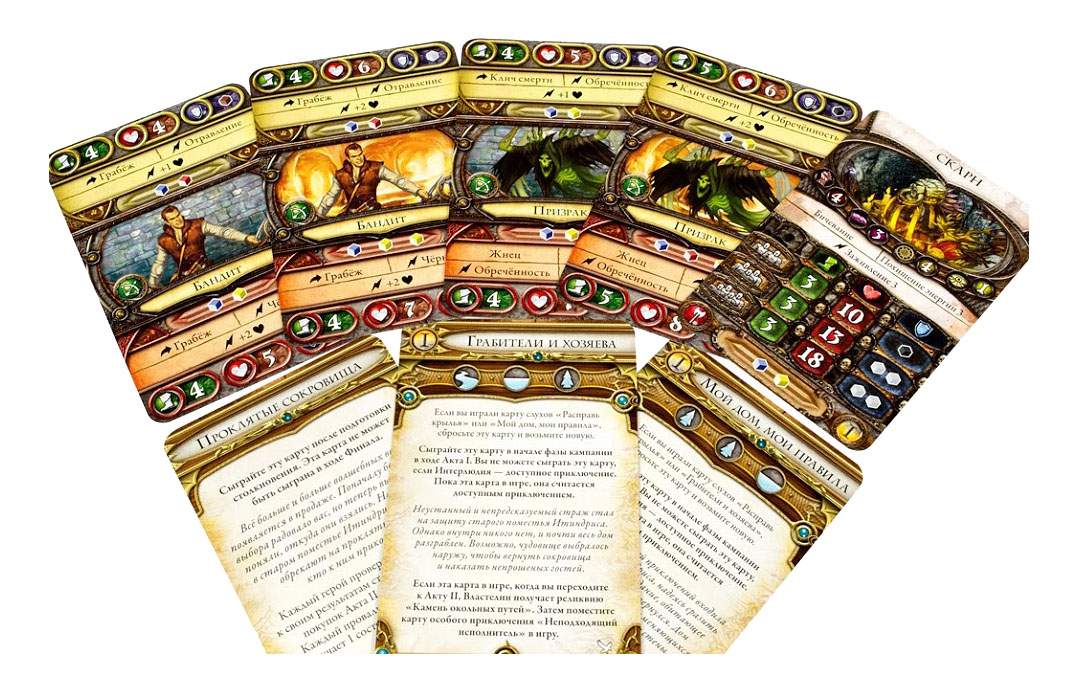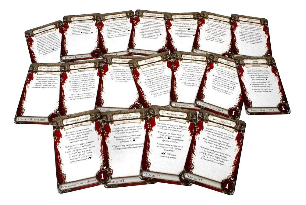 • Комплектация книга правил и приключений, 10 пластиковых фигурок, 2 листа героев, 21 карта классов, 9 карт покупок, 4 карты состояний, 4 карты реликвий, 18 карт Властелина, 4 карты монстров, 2 карты адъютантов, 4 карты слухов, 3 карты дополнительных приключений, 1 карта слуги, 16 участков поля, 1 жетон задачи, 5 жетонов состояний, 1 жетон слежки, 1 жетон адъютанта, 1 жетон слуги, 1 карта мини-кампании