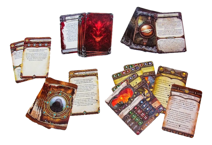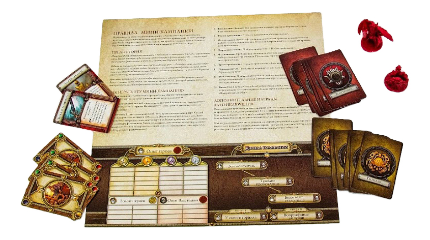 • Комплектация книга правил и приключений, 10 пластиковых фигурок, 2 листа героев, 22 карты классов, 3 карты дорожных событий, 9 карт покупок, 1 карта поиска, 4 карты состояний, 2 карты реликвий, 6 карт тайных комнат, 8 карт Властелина, 4 карты монстров, 2 карты адъютантов, 6 карт слухов, 2 карты дополнительных приключений, 1 карта мини-кампании, 12 участков поля, 1 участок тайной комнаты, 8 жетонов испытаний, 5 жетонов состояний, 15 жетонов классов, 1 жетон адъютанта, 1 жетон входа в тайную комнату, 5 жетонов неактивных монстров, 7 жетонов урона, 5 жетонов усталости