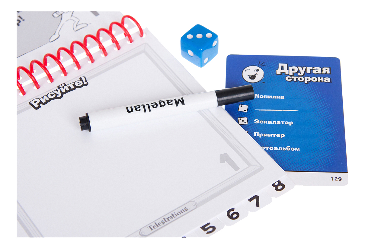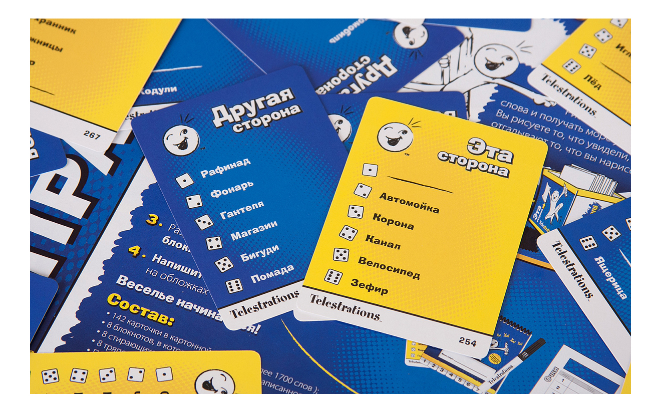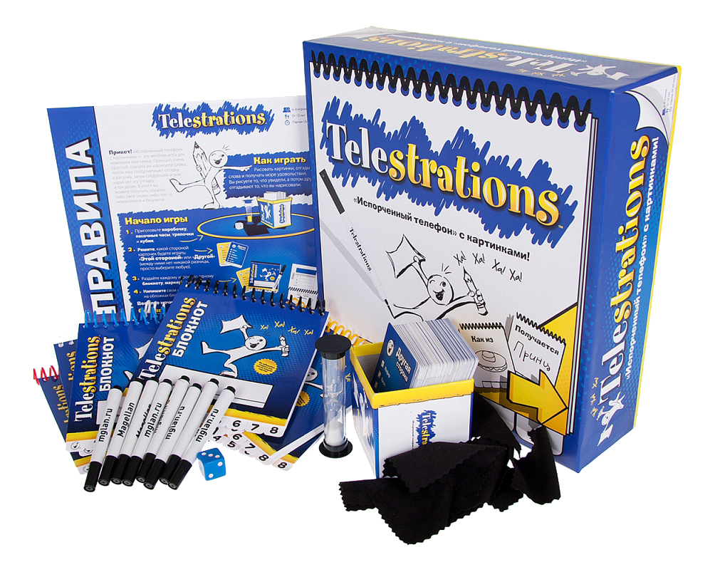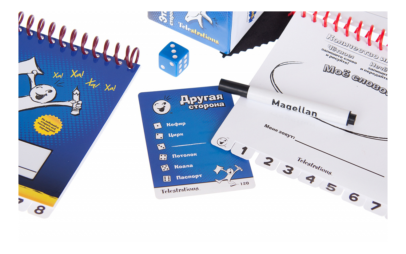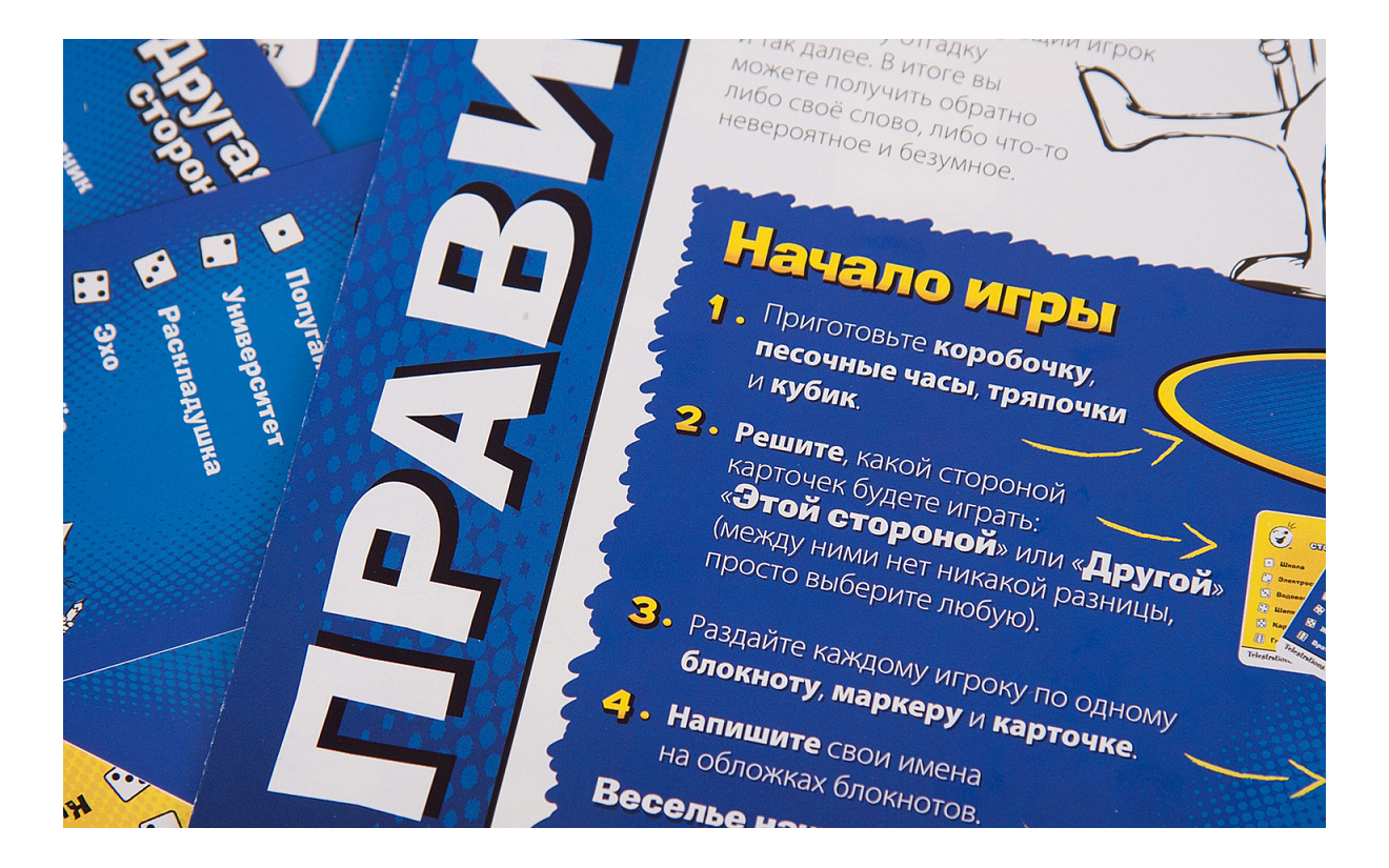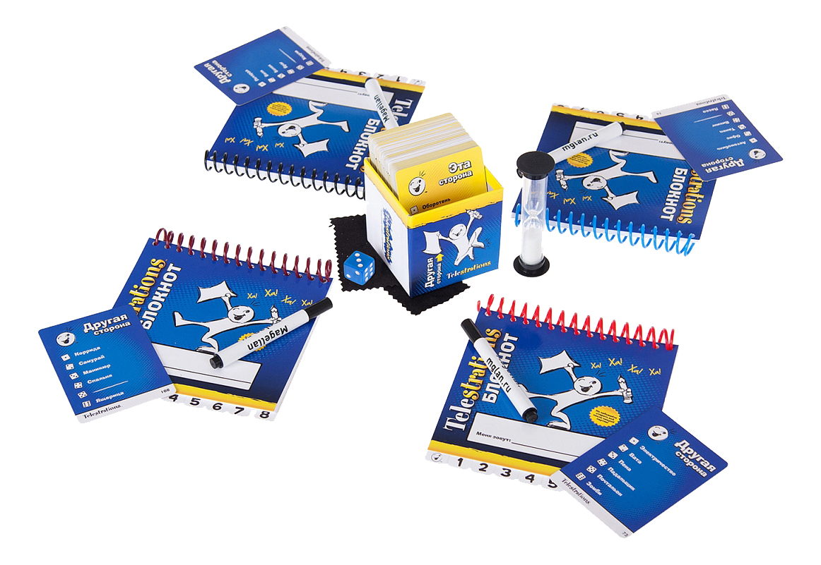 Комплектация142 карточки (более 1700 слов), 8 стирающихся маркеров, 8 блокнотов, в которых можно стирать написанное, песочные часы на 60 секунд, правила, 1 кубик